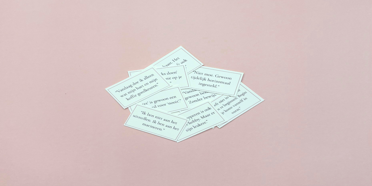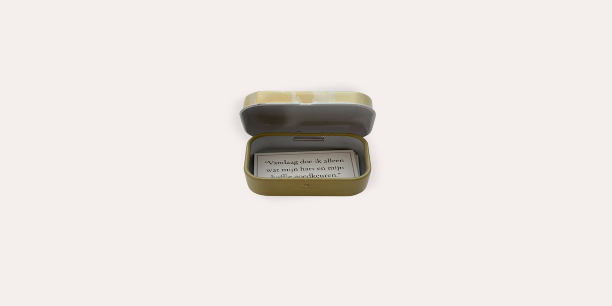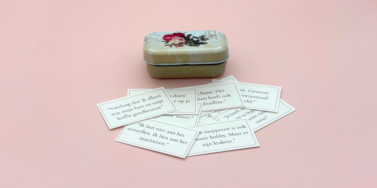 In dit blikje vind je 10 kaartjes (ca. 2,8 x 5 cm) met korte quotes die je met een knipoog weer even bij de les trekken. Het zijn luchtige, relativerende zinnetjes die je een glimlach geven én een zetje vooruit.