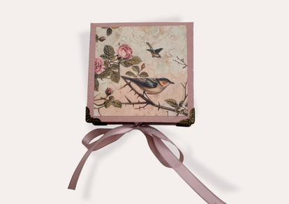 Het doosje is bekleed met papier in romantische vogelstijl, afgewerkt met metalen hoekjes en sluit met een zacht lint. Een cadeautje om open te maken, steeds weer opnieuw.