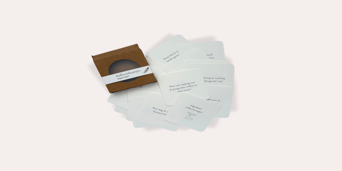 Een bundeltje van 20 handgemaakte reflectiekaartjes met korte, eerlijke vragen die je helpen ontdekken wat er in jou leeft en wat echt belangrijk voor je is.