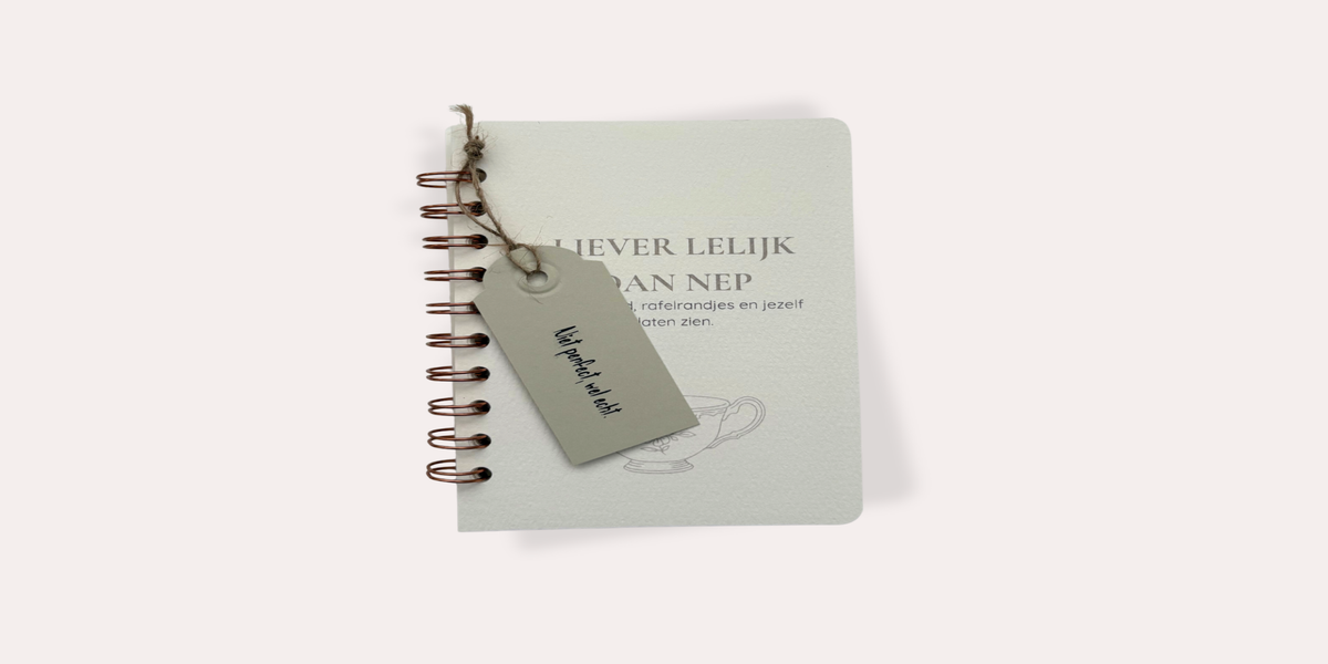 - Groen labeltje met touw, tekst: Niet perfect, wel echt