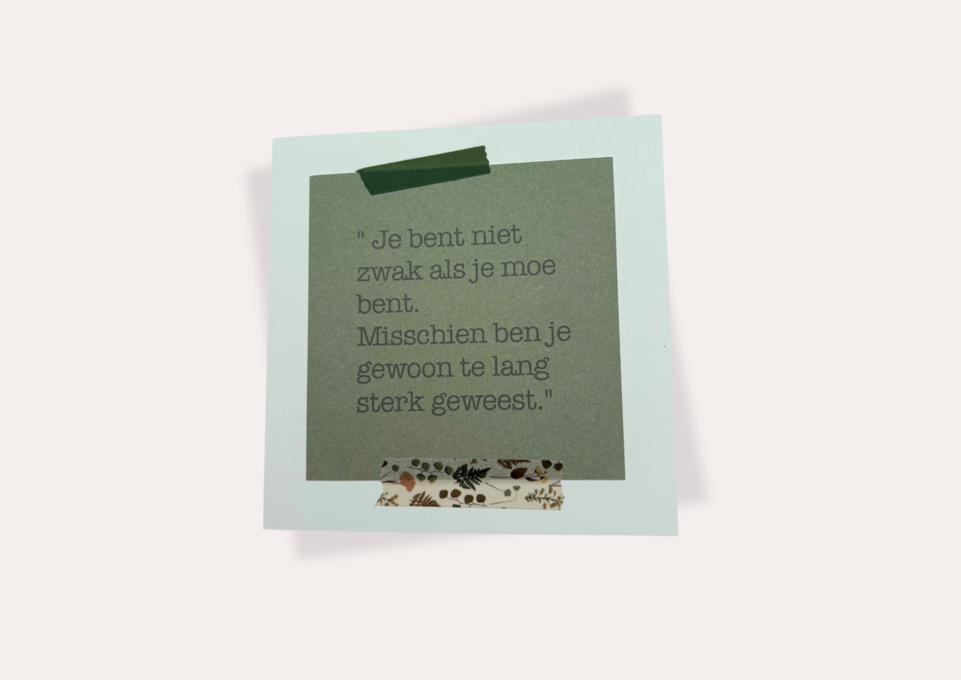 Handgemaakte kaart met de tekst “Je bent niet zwak als je moe bent. Misschien ben je gewoon te lang sterk geweest.” Zacht en troostend om te sturen of bewaren.