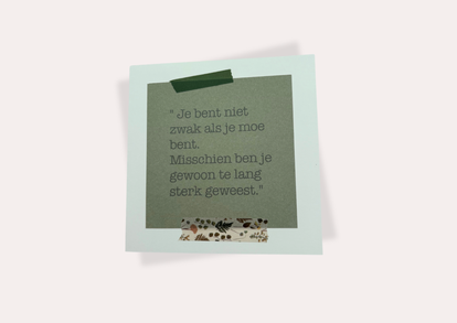 ♡ Handgemaakte kaart met de tekst: “Je bent niet zwak als je moe bent. Misschien ben je gewoon te lang sterk geweest.”